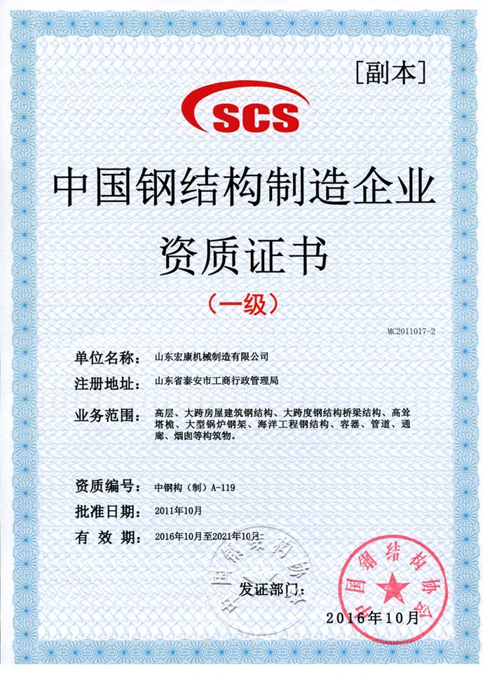 中國鋼結構制造企業(yè)資質證書